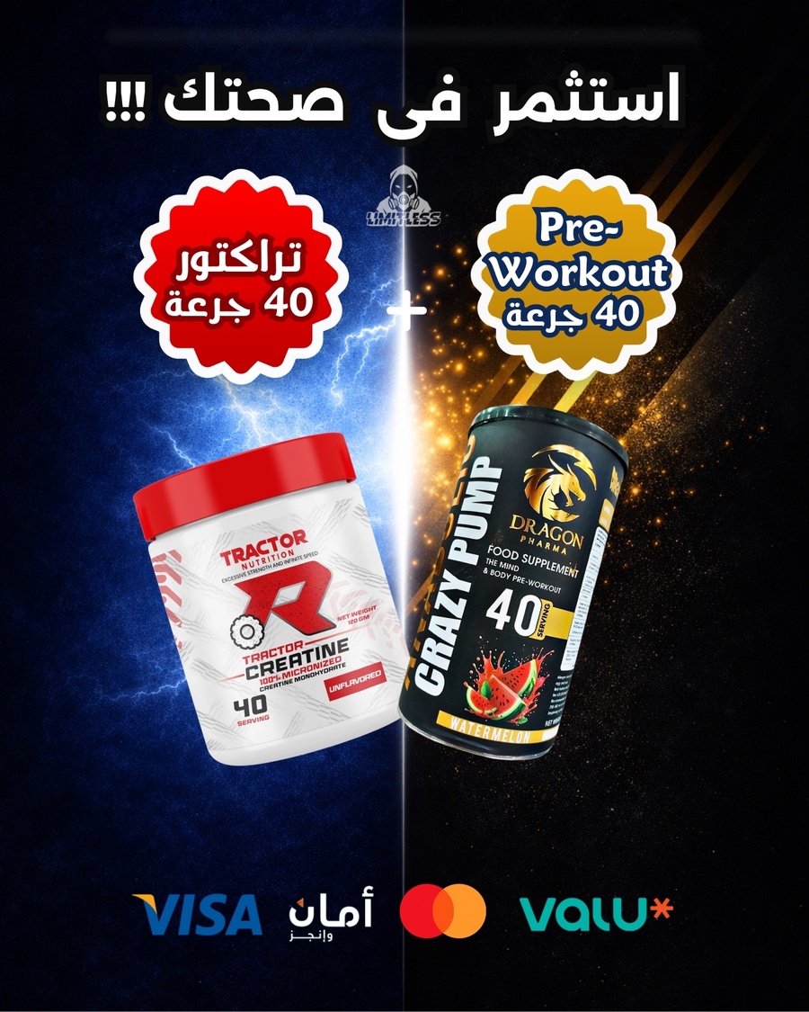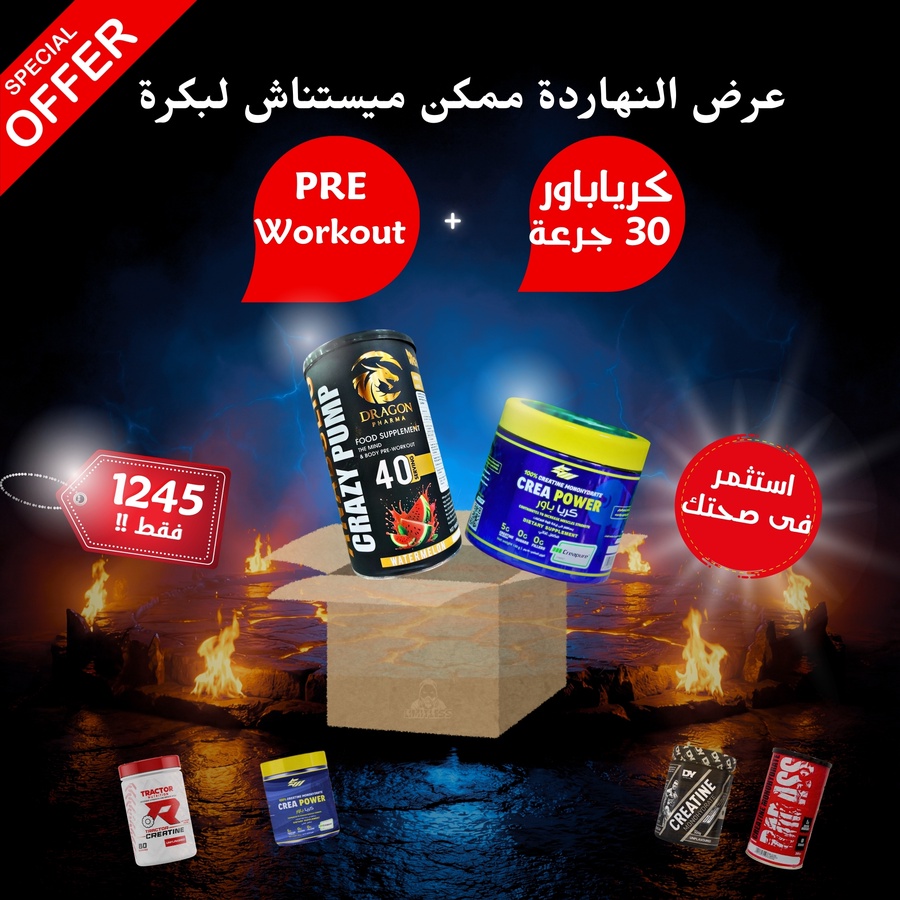 لا تفوت عرض التضخيم والطاقة المثالي ل الجيم. باقة (Anabolic + Pre-Workout + Creatine) تضمن لك تمرين خرافى واستشفاء سريع. كرياتين + برى ورك اوت