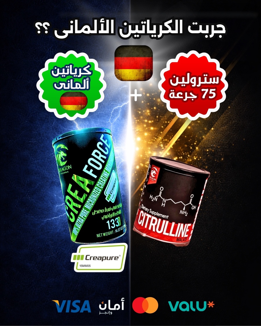 كتلة عضلية مع CreaForce! تركيبة تجمع بين نقاء كرياتين كريابيور الألماني والسترولين لضخ دم خرافي، طاقة جبارة فى الجيم، وبناء عضلي أسرع. اطلب العرض الآن!