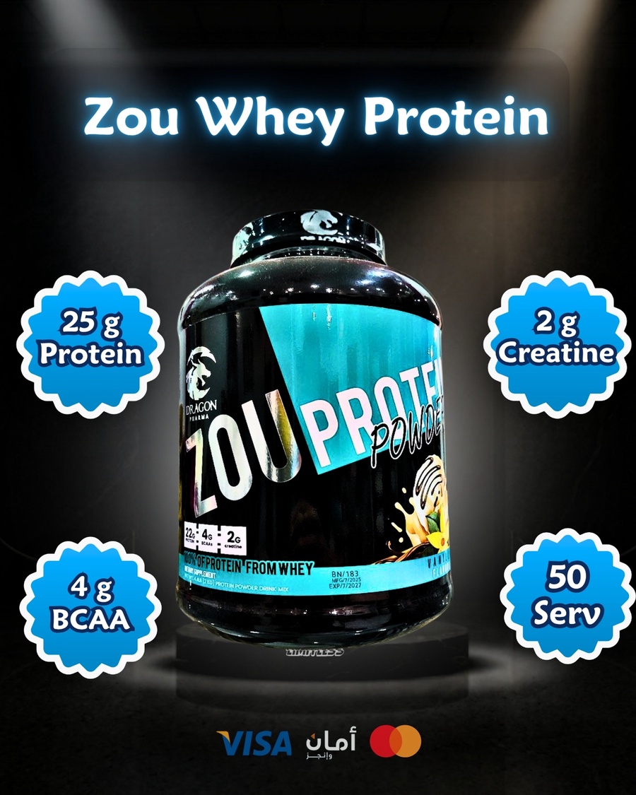 واى بروتين الزو غنى بالأحماض الأمينية ويحتوى على 2 جرام كرياتين فى كل جرعة و 22 جرام بروتين أسرع خدمة توصيل فى مصر Zou Protein Whey Concentrate Dragon Pharma