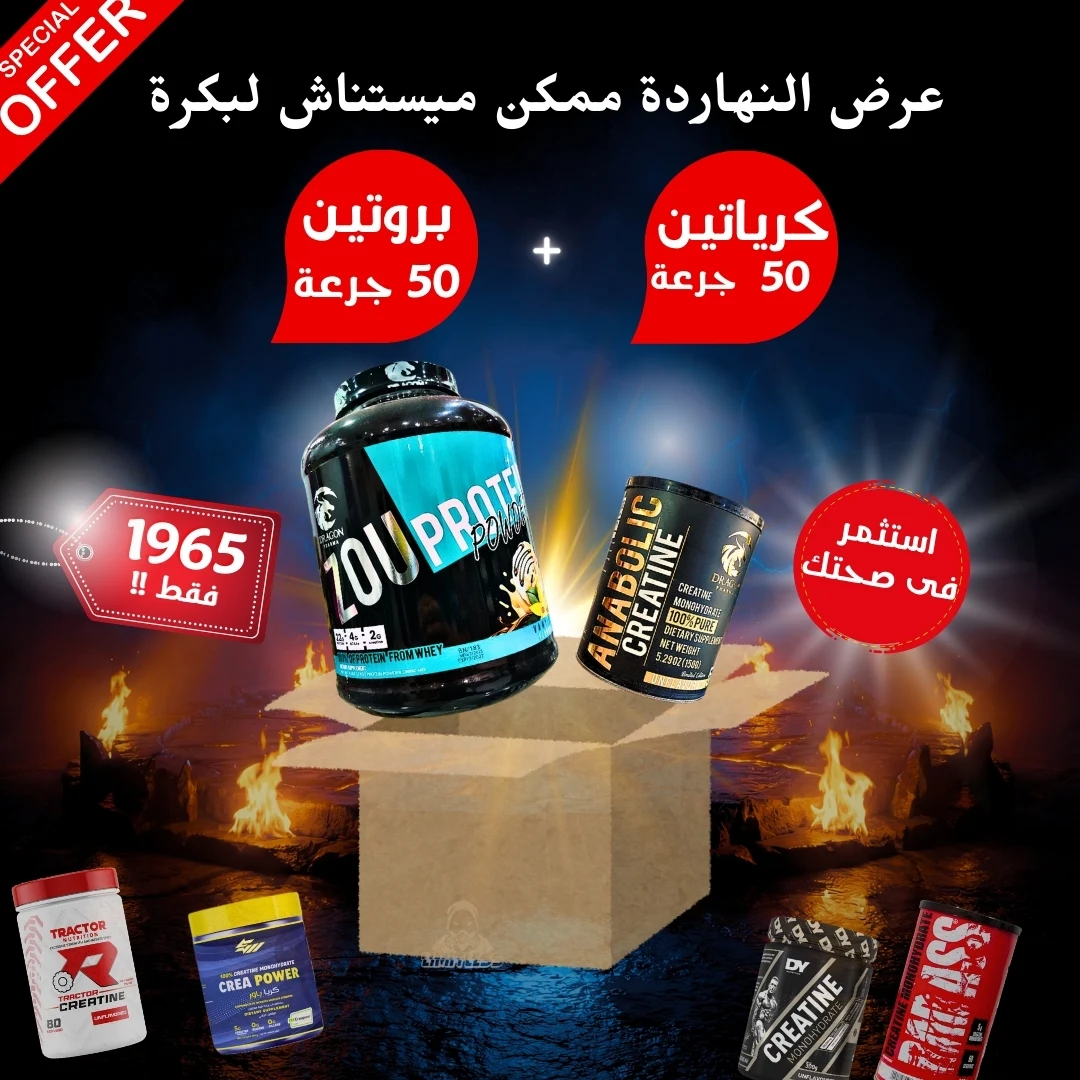 عرض واى بروتين كونسنتريت + كرياتين انابوليك مونوهيدرات: بناء عضلات وقوة هائلة.SKU: OFR-WPC-DBCR-MONO.