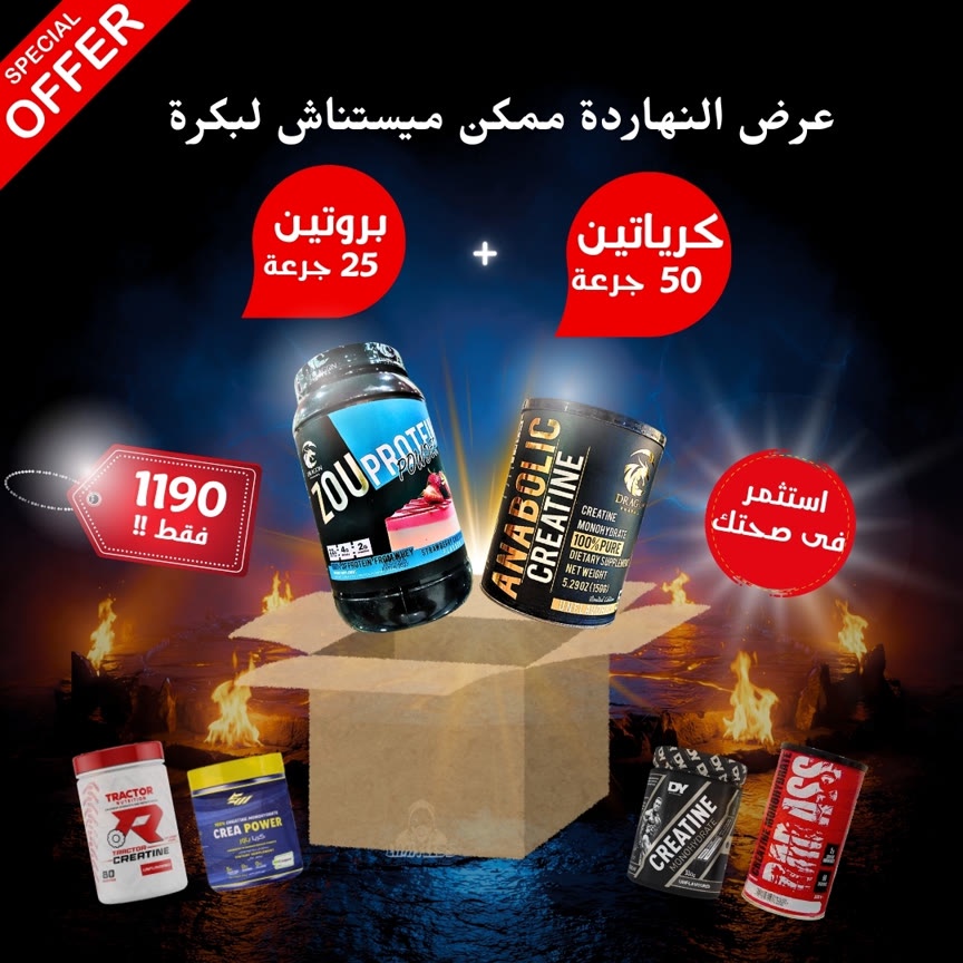 عرض واى بروتين كونسنتريت + كرياتين انابوليك مونوهيدرات: بناء عضلات وقوة هائلة.SKU: OFR-WPC-DBCR-MONO.